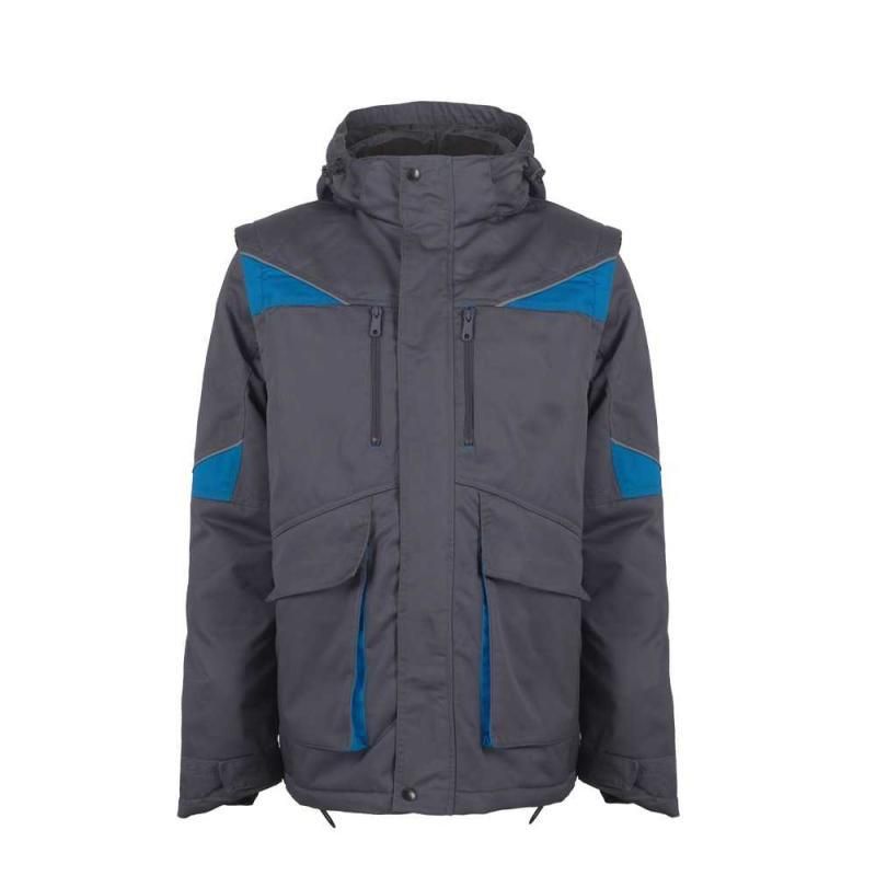 - Kialakítás: téli munkakabát levehető ujjal, álló gallérral